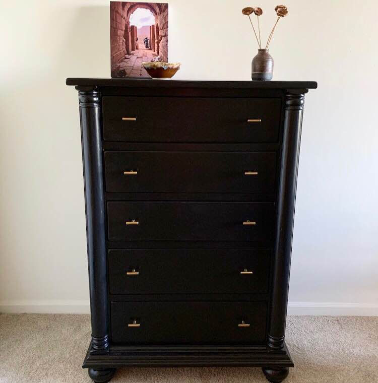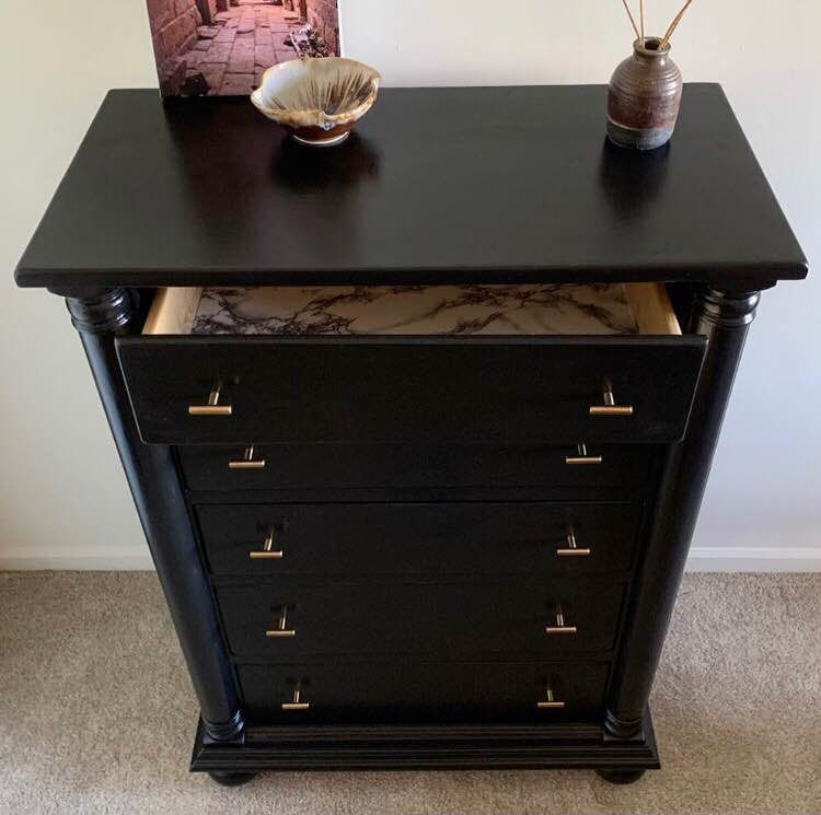 I chose brass handle pulls for the dresser (amazon) and love their appearance and how they contrast with the black dresser. My first hardware choice and it is a success! Now the only lingering question is whether to put contact paper in the drawers. Each drawer is 25.5” x ~14” and there are 5 drawers.