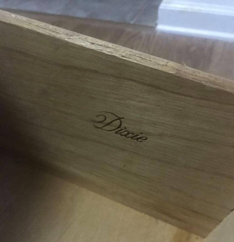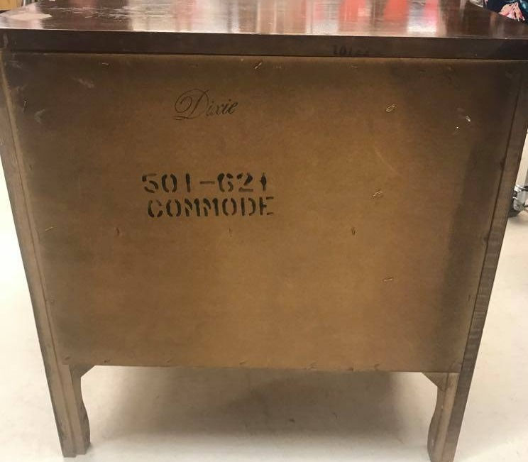 After being a little disappointed when striking out on Tuesday at HFH Restore and two thrift stores, I got lucky today (Thursday)! I went to Unique, a thrift & second-hand store in Merrifield, VA, and initially found a few pieces that I was pretty underwhelmed by, but right as I was about to walk away, I found a nightstand tucked away behind some other furniture. Looking more closely at the stamps on the furniture shows that it is a Dixie piece and it had a sticker priced for $19.99.